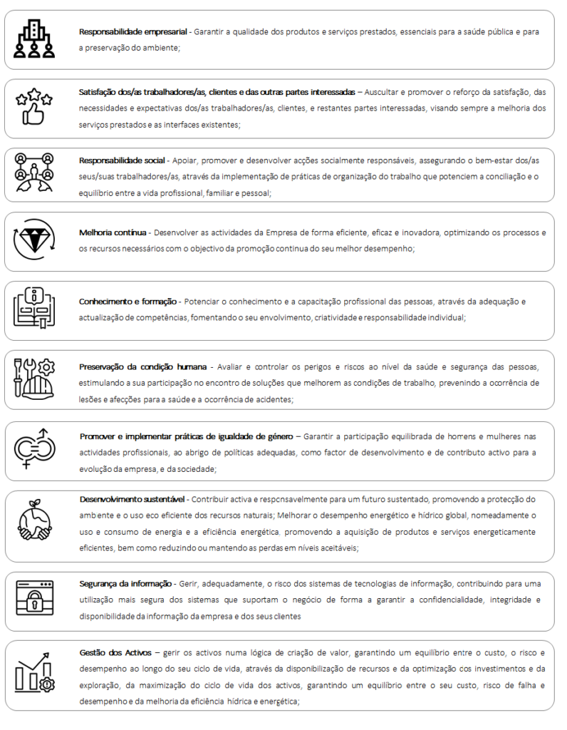 Gerir os sistemas de abastecimento de água e de saneamento sob sua responsabilidade nos termos da legislação em vigor, num quadro de eficiência e sustentabilidade económica, financeira, técnica e social, orientada por princípios de eficácia de gestão focalizado na optimização dos resultados, valorização dos recursos humanos e utilização das melhores práticas ambientais, contribuindo para a melhoria da qualidade de vida das populações e para o desenvolvimento socioeconómico dos municípios onde actua.